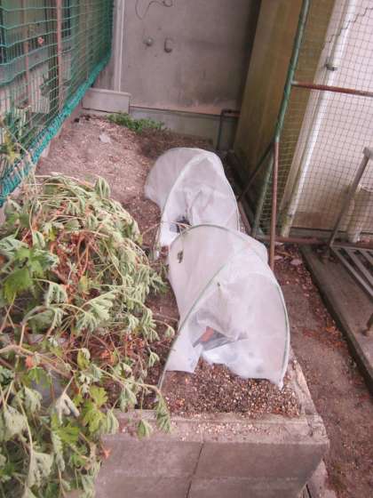 朝礼台横のバラ園が寒そうです。(午後まで,日光がなかなか当たりません。)