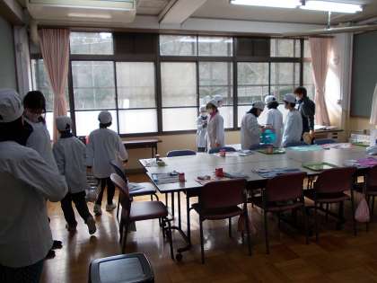 多目的室には暖かい日差しがさしこんで,楽しい給食のひとときです。