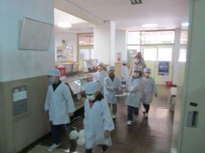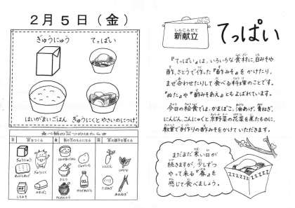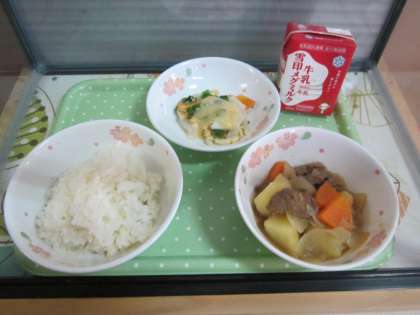 今日の給食は,胚芽米ごはん・牛乳・牛肉と野菜の煮つけ・てっぱいです。