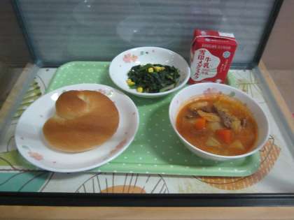 今日の給食は,バター渦巻パン・牛乳・ボルシチ・ほうれん草のソテーです。パン好きにはたまらないメニューです。