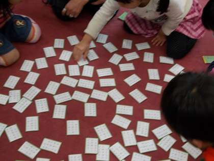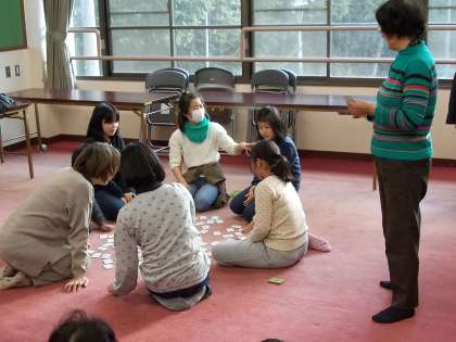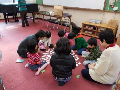いつもの多目的室は作品展なので,今日はふれあいルームで実施しました。まずは,低学年と高学年にわかれて,練習しました。
