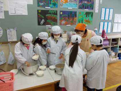 多目的室が造形展で使用中のため,高学年は家庭科室(理科室)で給食を食べています。