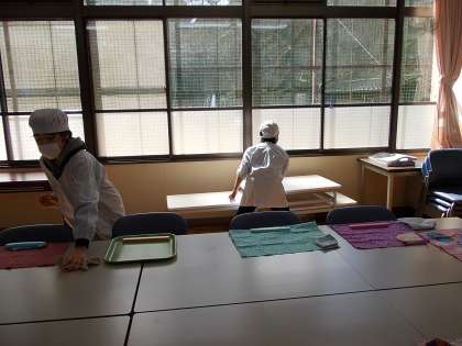みんなが給食を取りに行っている間,配膳台とテーブルを拭いています。戻ってくる前に拭き終わらなければならないので,忙しそうです。