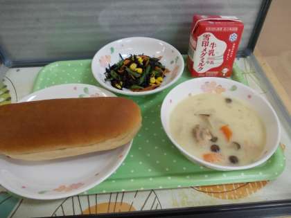 週に一度のパンの日,温かいシチューがおいしかったです。