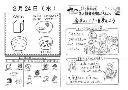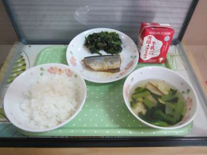 今日の給食は,ごはん・牛乳・さんまのかわり煮・ほうれん草のおかか煮・すまし汁です。