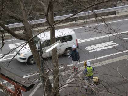 鞍馬街道の測量をされています。精密な機械で見てられます。