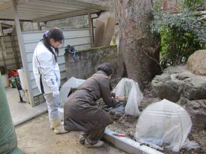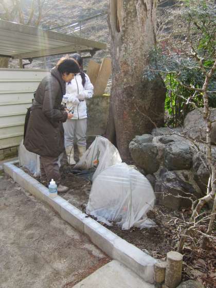 今はこんなに小さなバラ園ですが,今年の5月から秋にかけてのイメージと,世話の仕方を教わりました。寒い中,ありがとうございます。