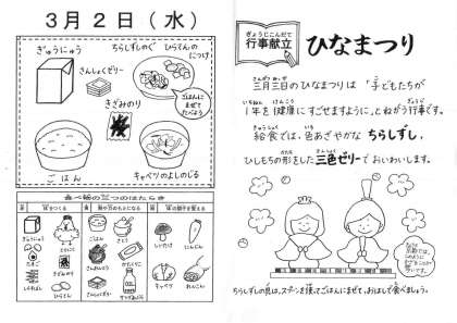 ひな祭りの行事献立で,三色ゼリーがついています。(写真には写っていません。)