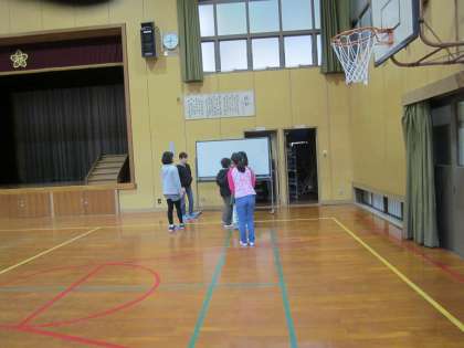 朝休みの様子です。教頭先生は“イングリッシュシャワー”で英語の音楽をかけています。高学年児童は体育館で“6年生を送る会”の準備をしています。