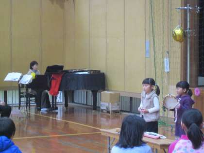 1年生は6年生に感謝の気持ちをこめて歌を歌いました。楽器の演奏では養護教諭も一緒に合奏しました。