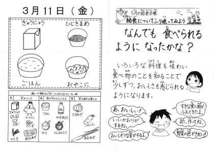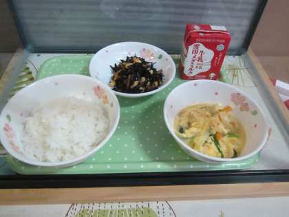 今日の給食は,ごはん・牛乳・親子煮・ひじき豆です。