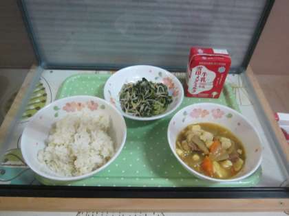 今日の給食は,麦ごはん・牛乳・和風カレー豆腐・ほうれん草ともやしのごま煮です。