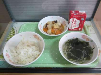 今日の給食は,麦ごはん・牛乳・プリプリ中華炒め・わかめスープです。