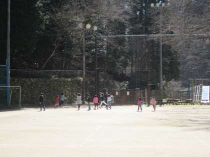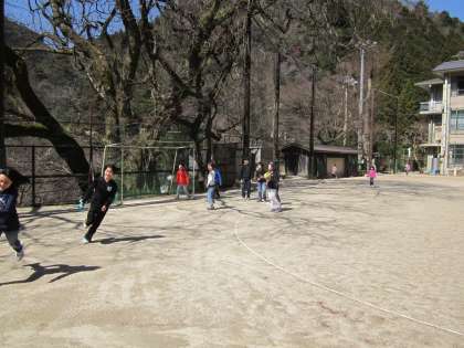 歯磨きをして運動場に出る児童です。ポカポカ陽気です。