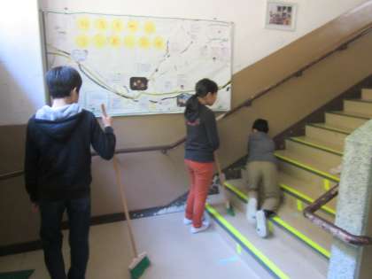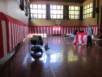 鞍馬小学校では,“卒業式前日準備”も,全教職員と全校児童で行います。