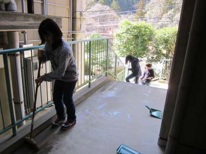 大人は高いところ,児童はほうきや雑巾,椅子並べから始めました。