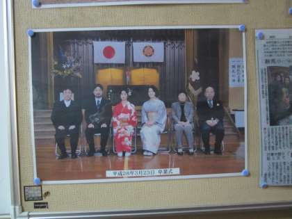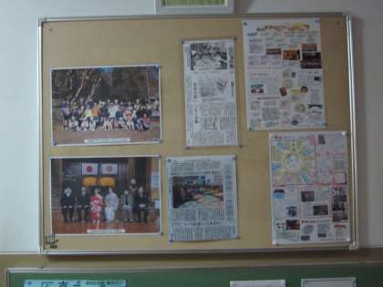 教務主任が写真や記事を“ラミネート”しています。