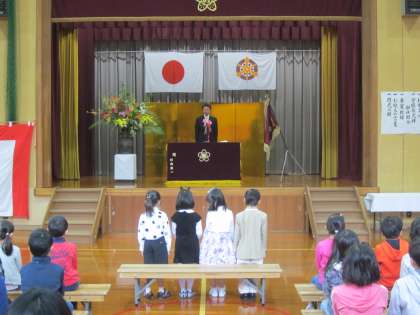 担任紹介やPTA会長様のお話し中も,しっかりとお話が聴ける『ピカピカの1年生』です。