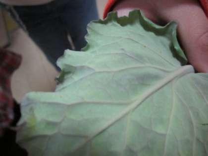 キャベツの葉っぱにモンシロチョウの卵が…。3年生の発見です。