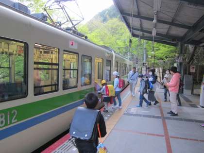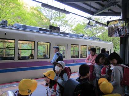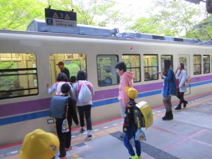 (駅から見える「消防出張所」の方に,ご挨拶をする鞍馬っ子がいました。)