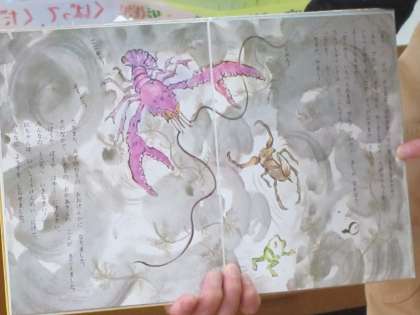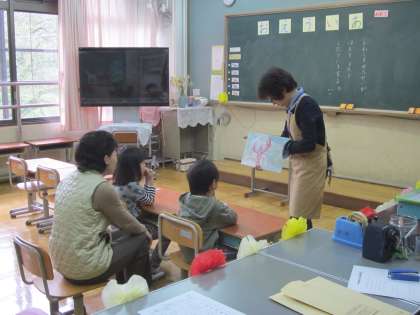 川島先生の『読み聞かせ』です。1年生が真剣な表情で聴いています。