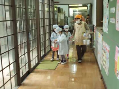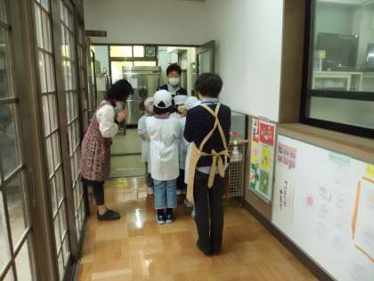 給食室の前で,