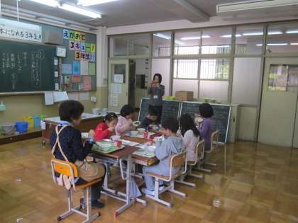 今日は,給食時間の学校訪問に,教育委員会から小川初美専門主事が来校されました。