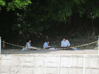 5年生は川のそばで描いていました。鳥や虫が近付いてきます。