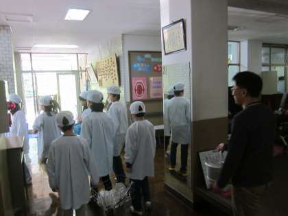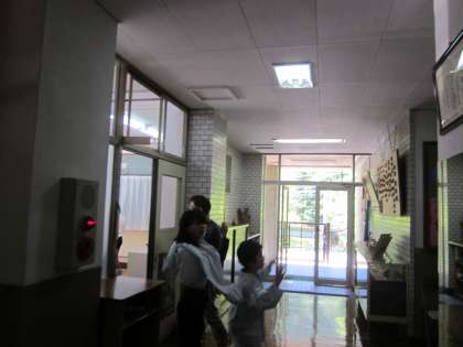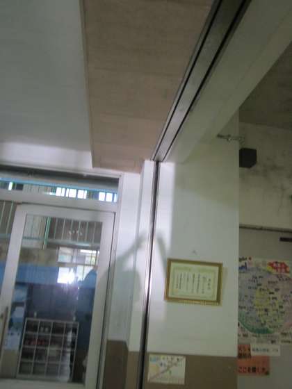 太陽光線が滑り台に当たって,児童の姿が影絵になって校舎内で見えました。