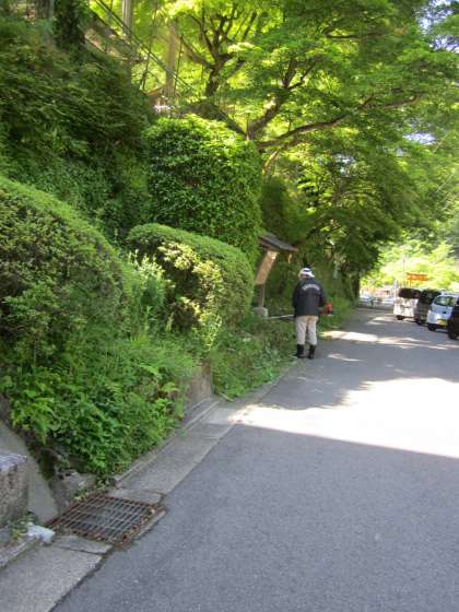 草刈りをする管理用務員さん,専用の工具や防護マスクを使います。