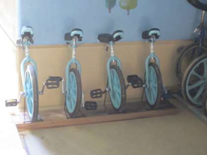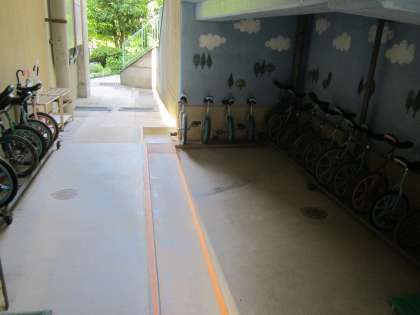 一輪車がずらっと整列しています。みんな後片付けが上手です。