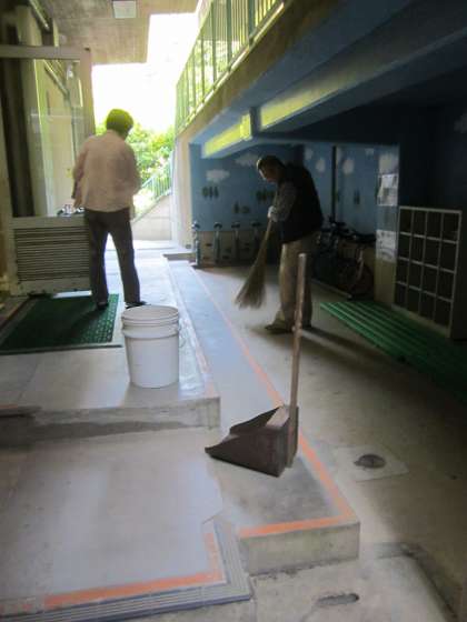 運動場から砂や土がここまで来ます。用務員さんが掃いてくれています。
