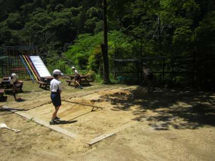 跳んだあとは…,ちゃんと砂場をならします。