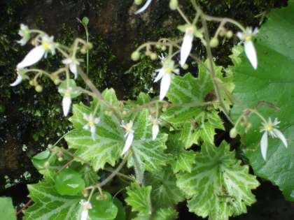 校門に続く石段の脇や土手にたくさん葉を広げているのが「ユキノシタ」です。北海道を除く,日本・中国に分布し,湿り気の多い反日陰の場所に生育します。葉は火傷や腫れ物などの消炎に用いられ,天ぷらにして食べることもできます。花言葉は「深い愛情」など。