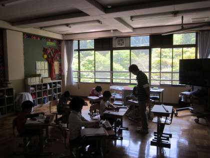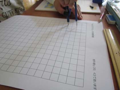 アシナガ蜂が教室に…。電気を消して,コンパスの練習です。