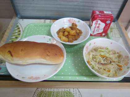 今日の給食は,チーズコッペパン・牛乳・豚肉のケチャップ煮・たっぷり野菜のビーフンです。