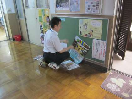 教頭先生がポスターなどの掲示物を貼り換えています。