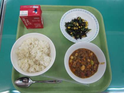 今日の給食は,麦ごはん・牛乳・キーマカレー・ひじきのソテーでした。