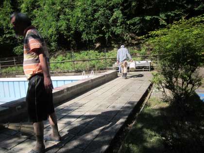 管理用務員さん・事務職員さんは,ここ数日,プールでの作業が続いています。(昨日の貴船神社例祭のバスにも,プールから手を振ってくださいました。)