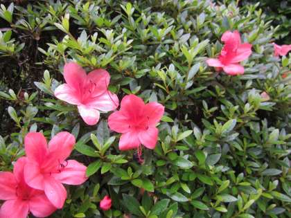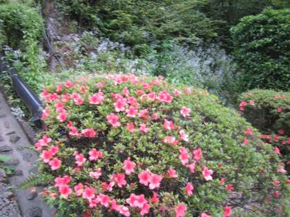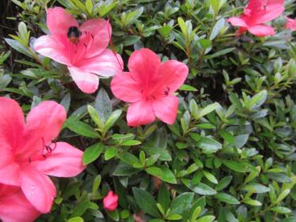赤いツツジと白いユキノシタと,黒い虫(蜜を吸いに来ています)が見えました。