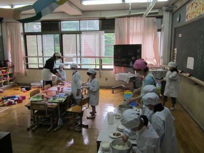 みんなで給食当番をしています。ヤケドをしないようにしよう。