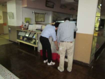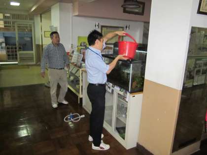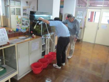 教頭先生と管理用務員さんが,水槽の水替えをしています。