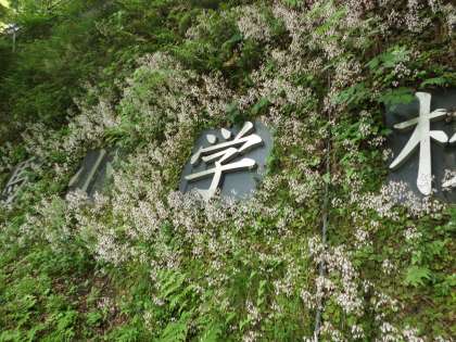 学校の石垣に設置されているプレートの周りは今,ユキノシタの花でいっぱいです。大の字のような白い花びらが石垣を覆っています。でもよく見ると他の花もさりげなく咲いています。紫の花は・・・カタバミでしょうか・・・?