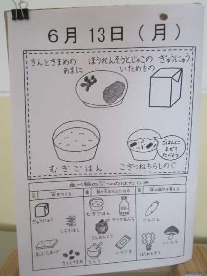 今日の給食は,麦ごはん・牛乳・こぎつねちらし(具)・金時豆の甘煮・ほうれん草とじゃこのいためものです。