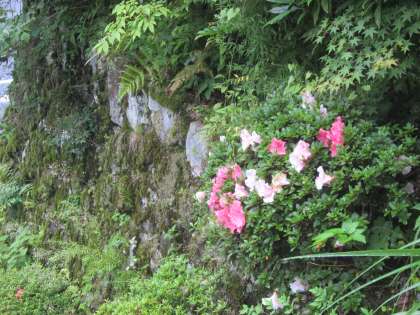 石段にツツジが咲いています。紅と白が混ざっています。