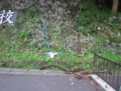 昨日の風雨で木が折れたり旗が倒れたりしていました。