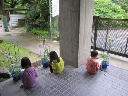 アサガオの観察をする1年生,