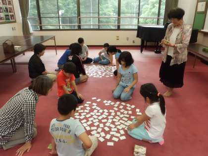 今日の部活動は百人一首です。1・2年生と3年生以上に分かれて取り組みました。上の句が読まれた瞬間に札を取れる人もいます。すごいですね。がんばって覚えましょう!
