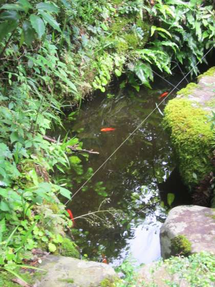 今朝も何となく蒸し暑く感じる朝です。池の金魚は元気です。