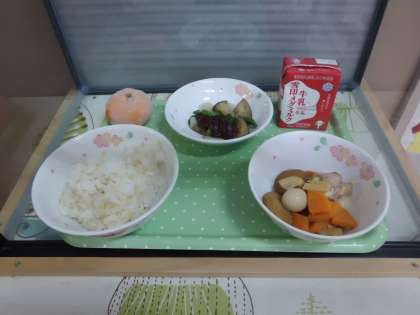 今日の給食は,牛乳・玄米ご飯・ひらてんの煮つけ・京野菜のごまみそかけ・みかんです。
